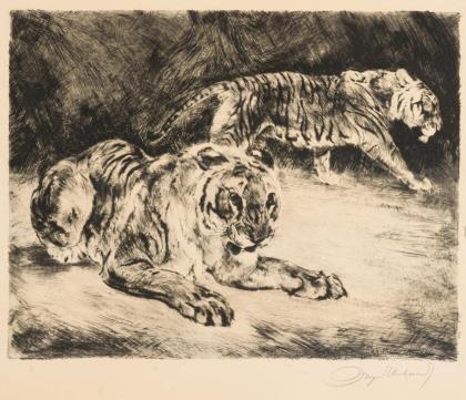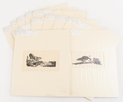 13 kunstvolle Tierdarstellungen auf Einzelblättern aus dem Zyklus "Reinecke Fuchs": Widderkopf, schnuppernder Fuchs, steigender Bock, Fuchs der Türglocke gefangen, tote Krähe, Löwenkopf, Fuchs im Brunneneimer, rennender Hund, kämpfender Fuchs und Hase, Wolf und Fuchs sich streitend, fliehender Fuchs, liegender Fuchs, erhängter Fuchs