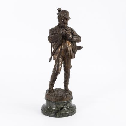 Bärtiger Jäger mit Flinte und Rebhuhn beim Stopfen der Pfeife