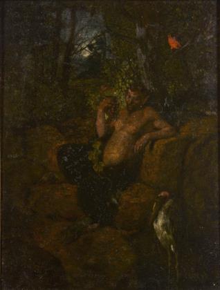 Gelassen auf dem Felsen neben der Quelle sitzender bocksbeinige Hirtengott, der eine
