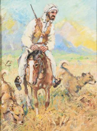 Orientalischer Jägersmann zu Pferd mit Spürhunden im hohen Gras vor dem Gebirgszug