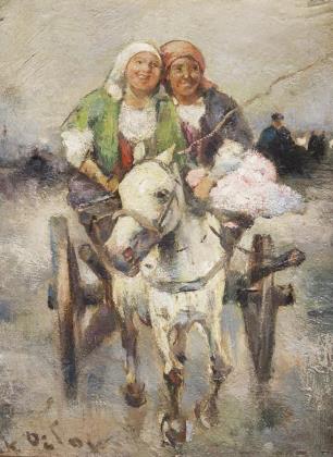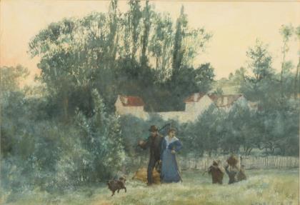 Bauernpaar auf dem Heimweg am Abend nahe dem Dorf