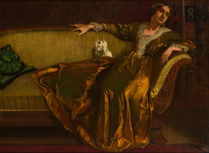 Feine Dame im goldenen Kleid mit kleinem Terrier auf dem Sofa