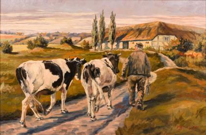 Der Bauer mit den Tieren auf dem Heimweg bei tief stehender Sonne nahe dem Hof