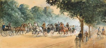 Viele Kutschen in schnellem Galopp auf der breiten Allee mit Zuschauern unter den Bäumen