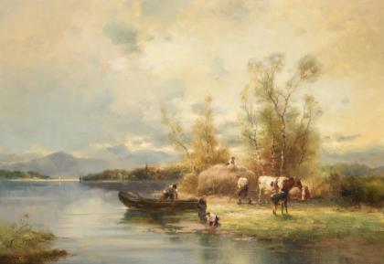 Bauernvolk beim Beladen des Ochsenkarrens am Flussufer