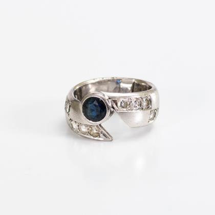 3 zargengefasste Brillanten und 2 Saphire, zwischen Mitteloval und pfeilartigen Enden.