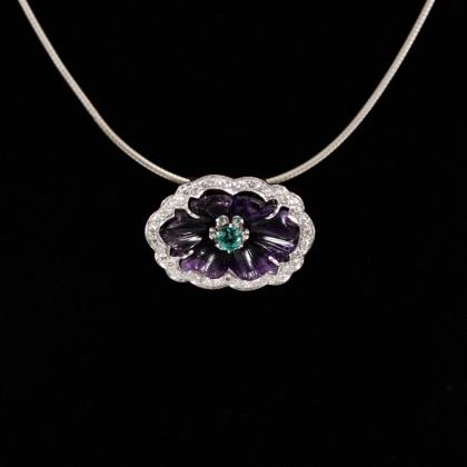 Mehrpassiger Anhänger mit geschnittener Amethystblüte, chatongefasstem Turmalin und 40 eingelassenen Brillanten. Verso 2 starre Ösen. Collierkette mit Bajonettverschluss