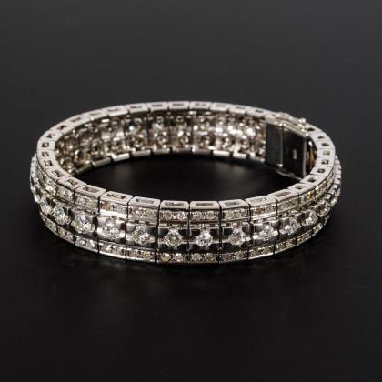 Massives Gliederband, besetzt mit 27 Brillanten, 7 Diamanten und 142 kleinen, eingelassenen Diamanten 8/8. Kastenschloss mit 2 Achtersicherungen