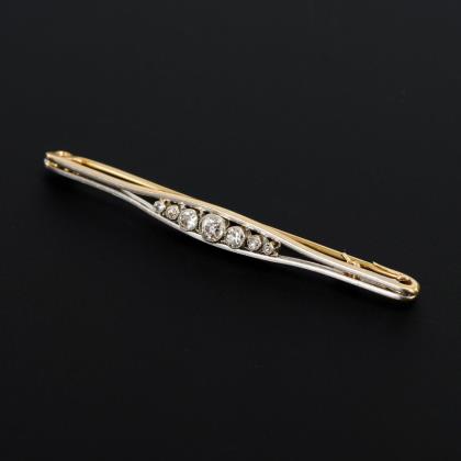 7 zargengefasste Altschliff-Diamanten im Verlauf, zwischen 2-stegiger Nadel. Hakenverschluss mit Kippsicherung