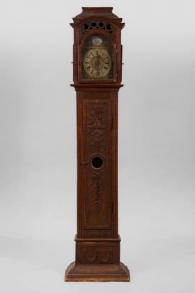 Mit historistischen Schnitz- und Drechselelementen verziertes Gehäuse mit vergoldeten Messingblechapplikationen, Bekrönung fehlt