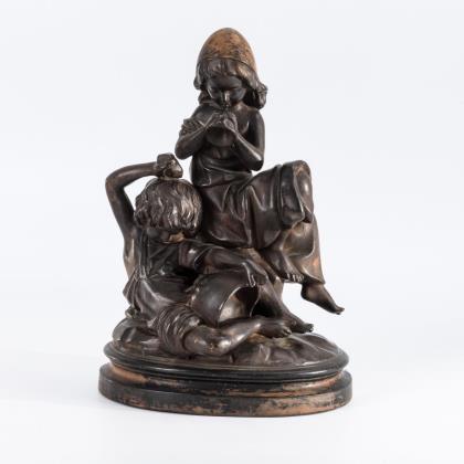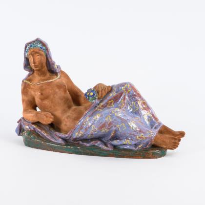 Teils in ein violettes Tuch gehüllter weiblicher Akt mit blauen Blumen, auf grünem Ovalsockel