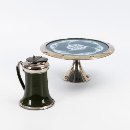 Ornamental reliefierte Tortenplatte mit Metallrand und hohem Rundfuß (H 16 cm, Ø 34,5 cm), grün-silbernes Kännchen mit gewulstetem Hals und abnehmbarem Deckel (H 20,5 cm)