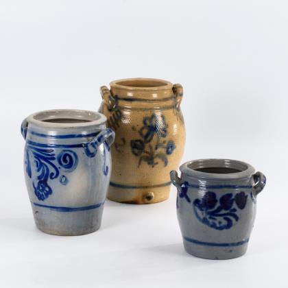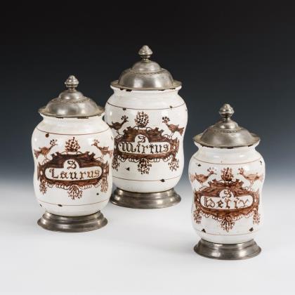 Zylindrische Albarelli mit leicht eingeschnürtem Bauch, schauseitig gemalte Rollwerkkartuschen mit Vögeln und Bezeichnung. Gewölbte Zinndeckel mit Kugelknauf, innen undeutlich gepunzt, Zinnstandring