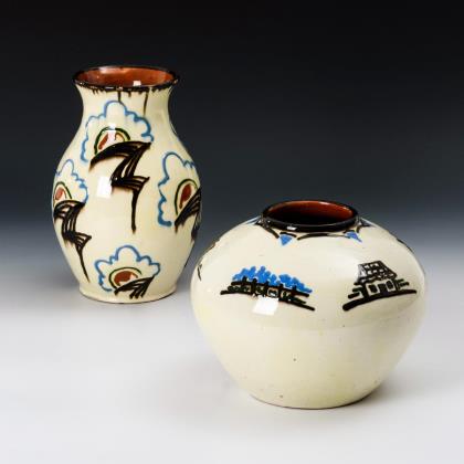 Vase in Birnform (H 23 cm) und bauchig-gedrückte Vase (H 17 cm) mit stilisierter Flora und Fauna sowie Architektur