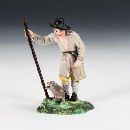 Junger Wandersmann mit langem Stab und Ratte, auf Natursockel