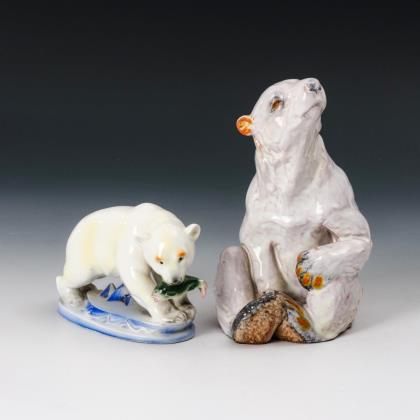 Bär mit Fisch im Maul auf Sockel (H 9 cm) und sitzender Bär (H 18 cm)