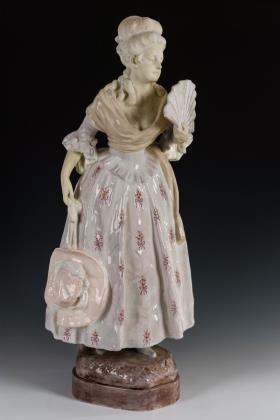 Große Rokoko-Dame mit Fächer und Krinolinenkleid auf Natursockel