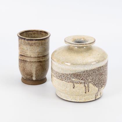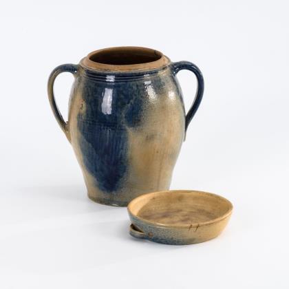 Zylindrischer Zwei-Henkel-Topf (H 21 cm) und flache Zwei-Henkel-Schale mit Loch (Ø 14,5 cm)
