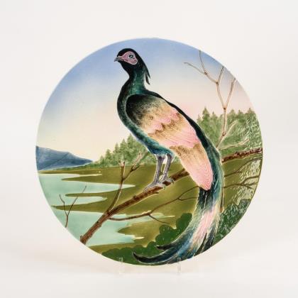 Runder Reliefteller: Auf einem Ast sitzender Pfau in Sommerlandschaft. Verso mit Aufhängung