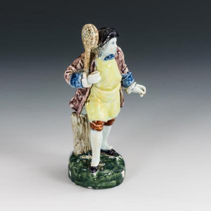 Fayence-Figur: Mann mit Waffeleisen auf grünem Rundsockel