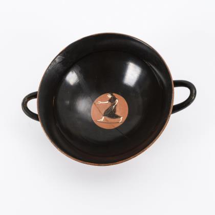 Altgriechisches Trinkgefäß in Form einer flachen Rundschale mit 2 Henkeln