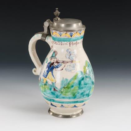 Birnform mit endvolutiertem Bandhenkel. Schauseitig ein schießender Jäger und ein Hirsch, darüber ein Jagdspruch. Flacher Zinndeckel mit Kugeldrücker, Zinnstandring