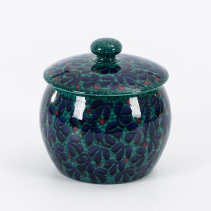 Bauchige Dose mit flachem, überkragendem Deckel mit rundem Knauf