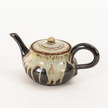 Gedrückt-bauchiger Korpus mit schlanker Tülle und Henkel, flacher Deckel mit Rundknauf
