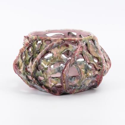 Runder, organisch geformter Cachepot (?) mit geschrägten Wandungsrippen und heterogenen Durchbrüchen
