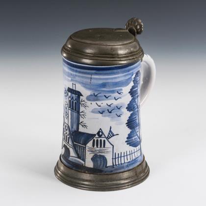 Walzenkrug mit Kirchenarchitektur zwischen hohen Bäumen, strichverzierter Bandhenkel, gepunzter Zinndeckel mit Muscheldrücker, Zinnstandring