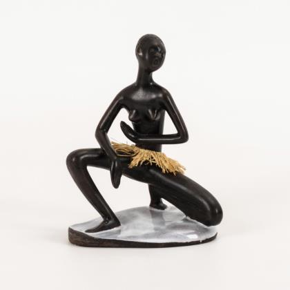 In Tanzhaltung kniende Afrikanerin mit Baströckchen, auf flachem Sockel