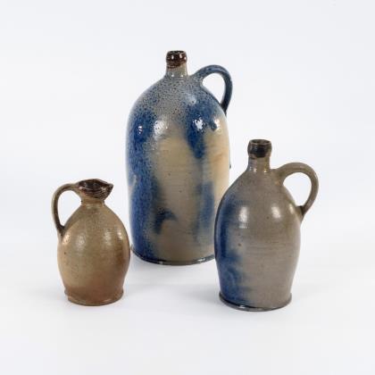 2 rheinische Birnkrüge mit Zinndeckel und Schachbrettdekor