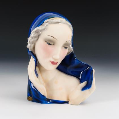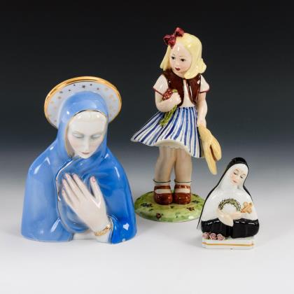 Ronzan: Madonna mit Heiligenschein und blauem Schleier (H 24,5 cm). Nonnenbüste mit Dornenkranz, Kreuz und Rosen (H 12,5 cm). Lenci: Auf einem Blumensockel stehendes Mädchen in volkstümlicher Bekleidung (H 28,5 cm)