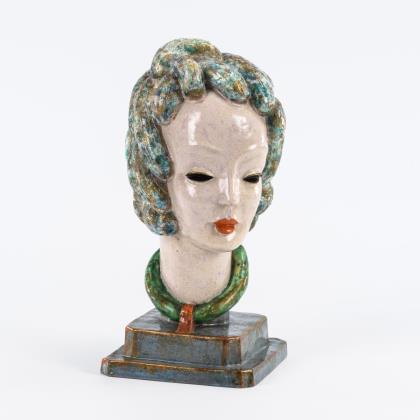 Moderne Büste einer jungen Frau mit grünem Halsring, auf gestuftem Sockel