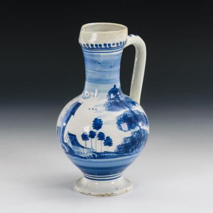 Kugelbauchkrug mit hohem Zylinderhals, Bandhenkel und Rundfuß. Schauseitige Turmarchitektur mit flankierenden Etagenbäumen