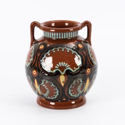 Bauchige Doppelhenkelvase mit ausgestellter Lippe und Rundfuß. Stilisierter Muscheldekor