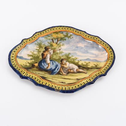 Ovale Vierpassschale mit gestricheltem Profilrand, im Spiegel ein Landschaftsausschnitt mit Figurenpaar