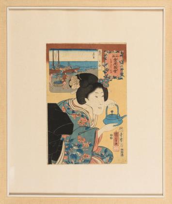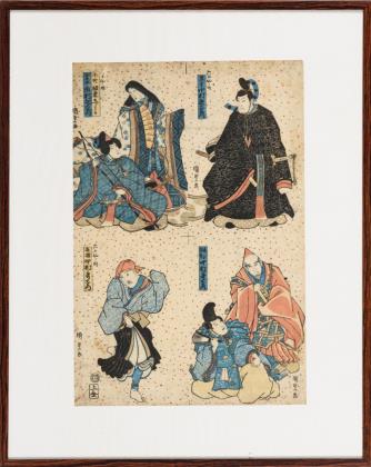 Dame mit Teekanne: Utagawa Kuniyoshi: "Nagato kani - Oshaku ga itashitai (Krabben aus nagato - Einem Gast Sake einschänken). Aus der Serie "Sankai medetai zue (Glückverheißende Wünsche zu Land und zu See), Blatt 44, 1852. / Mann auf dem Dach: Utagawa Kunisada: "Der Kabuki-Schauspieler Onoe Tamizo als Sato Tadanobu-kudari, 1841. / Samurai im blauen Kimono: Ichiyusai Kuniyoshi ga: "Bando Mitsugoro als Sumotori Akitsushima Kuniemon". Teilstück eines Sumo-Triptychons, 1832. / Stehender Mann mit Behälter: Utagawa Toyokuni III (Kunisada): "Ame-uri Fukuyoshi" (Bonbonverkäufer). 1854 / Zwei Männer im Streit: Utagawa Toyokuni III (Kunisada): "Kirare Yosa und Yahan Chusuke" aus der Serie: "Mitate sanjurokku sen" (Vergleiche von 36 ausgewählten Gedichten), 1856