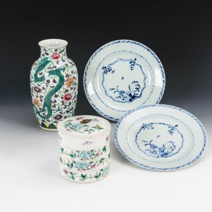 Zwei gleiche Teller mit dezenter Blaumalerei, dünnwandiges Porzellan. Ø 23,5 cm. / Kleine, polychrome Balustervase mit Phönix und Drachen zwischen Blumenranken. H 24 cm. / Vier stapelbare Schüsseln mit geradem Rand und einem Deckel. Grüntoniges Blumendekor. H 11,5 cm, Ø 12 cm