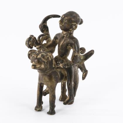 Auf einem Fabeltier (Hund?) reitende, sechsarmige Figur mit verschiedenen Attributen in den Händen