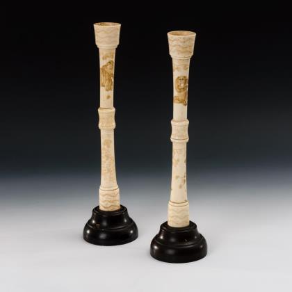 Durch gedrechselte Gewinde verbundene Einzelteile mit zarter Bildgravur von Affen und Frauen. Innentülle mit Doppelrand