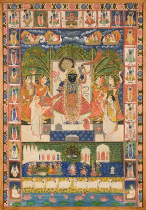 Schwarzgesichtigte Figur im Zentrum stehend, umgeben von Frauen. Die Figur wiederholt sich mehrfach als Umrandung. Unten Palastszene und weiße Stiere