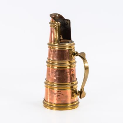 Konische Kanne mit gliedernden Reifen und beweglichem Griff. Breite Tülle, die das Gefäß nach oben verlängert