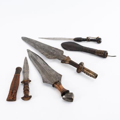 Zweischneidige Lanzenklinge mit Teilen des Schaftes (Schaft mit Defekten). L 53 cm. / Messer mit breiter, fein gemusterter Klinge. Keilförmiger Eisenknauf. Solche Stücke werden auch als Währung gehandelt (Zentralafrika). L 43 cm. / Einfache Klinge, sehr spitz zulaufend, in schön gearbeiteter Lederscheide. L 36 cm. / Leichtes Gebrauchsmesser mit Holzgriff und Lederscheide. L 29 cm