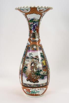 Balustervase mit schlankem Korpus und weit ausgestelltem, gewelltem Rand. Polychrome Bildkartuschen mit figürlicher Bilderfolge, Landschaftsdarstellung teils mit Fuji
