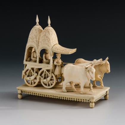 Vierrädriger Karren mit zwei Figuren unter Baldachinen. Auf flachem Sockel. Fein geschnitztes Reliefmuster