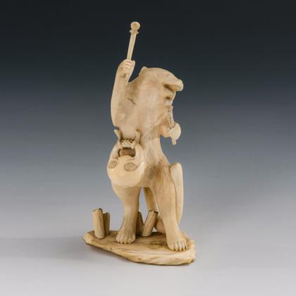 Vermenschlichtes Tier mit zwei Schlegeln und einer großen, umgehängten Schelle