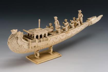 Zierlich beschnitztes Boot mit Schuppenmuster und Baldachin. Zwei Reihen aufsteckbare Ruderer