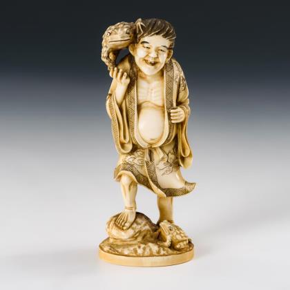 Mythologische Figur mit nackter Brust und zwei großen Kröten