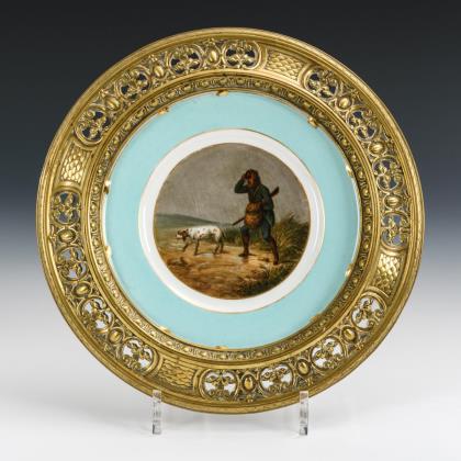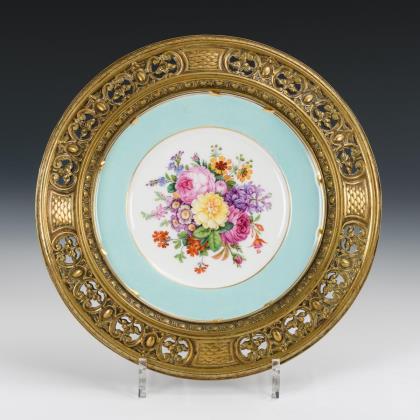 Teller mit goldbronziertem Rocaillereliefrand, im Spiegel Blumenmalerei mit Orchideen